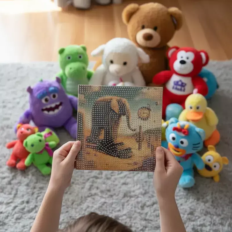 Cada kit incluye 1 diseño importado con todos los materiales necesarios para crear tu propia obra brillante: lienzo adhesivo, piedras de colores y herramientas.
